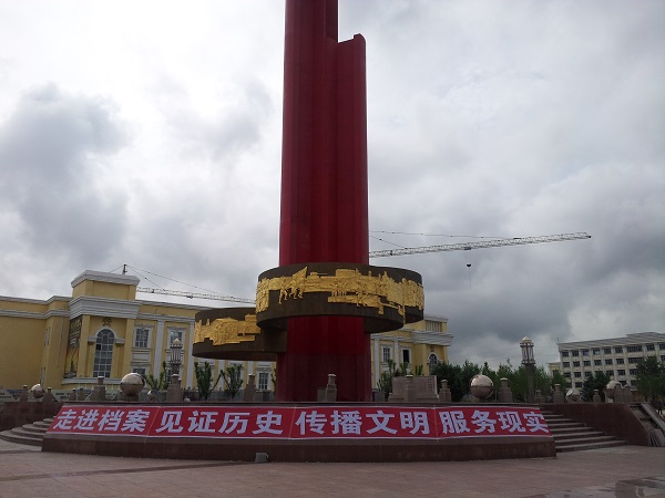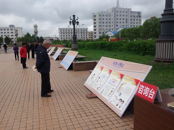 满洲里市档案史志局在街心广场集中开展宣传。图为市民正在观看“走进档案”展览。