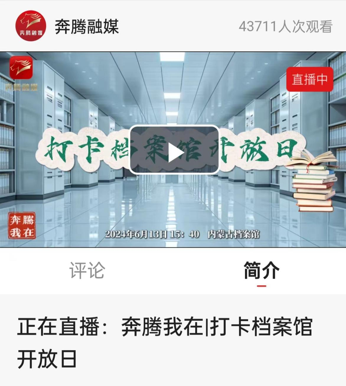 6月13日,在内蒙古自治区档案馆第七次档案馆开放日活动期间,奔腾融媒记者走进内蒙古自治区档案馆,在奔腾融媒官方平台进行“打卡档案馆开放日”直播,带领观众线上参观“中国共产党人的家风档案展”、清末垦务档案展,并进入裱糊修复室,观摩档案工匠细心修裱破损历史档案,同时带领广大观众了解查阅利用档案的流程。直播累计达4万余次观看。