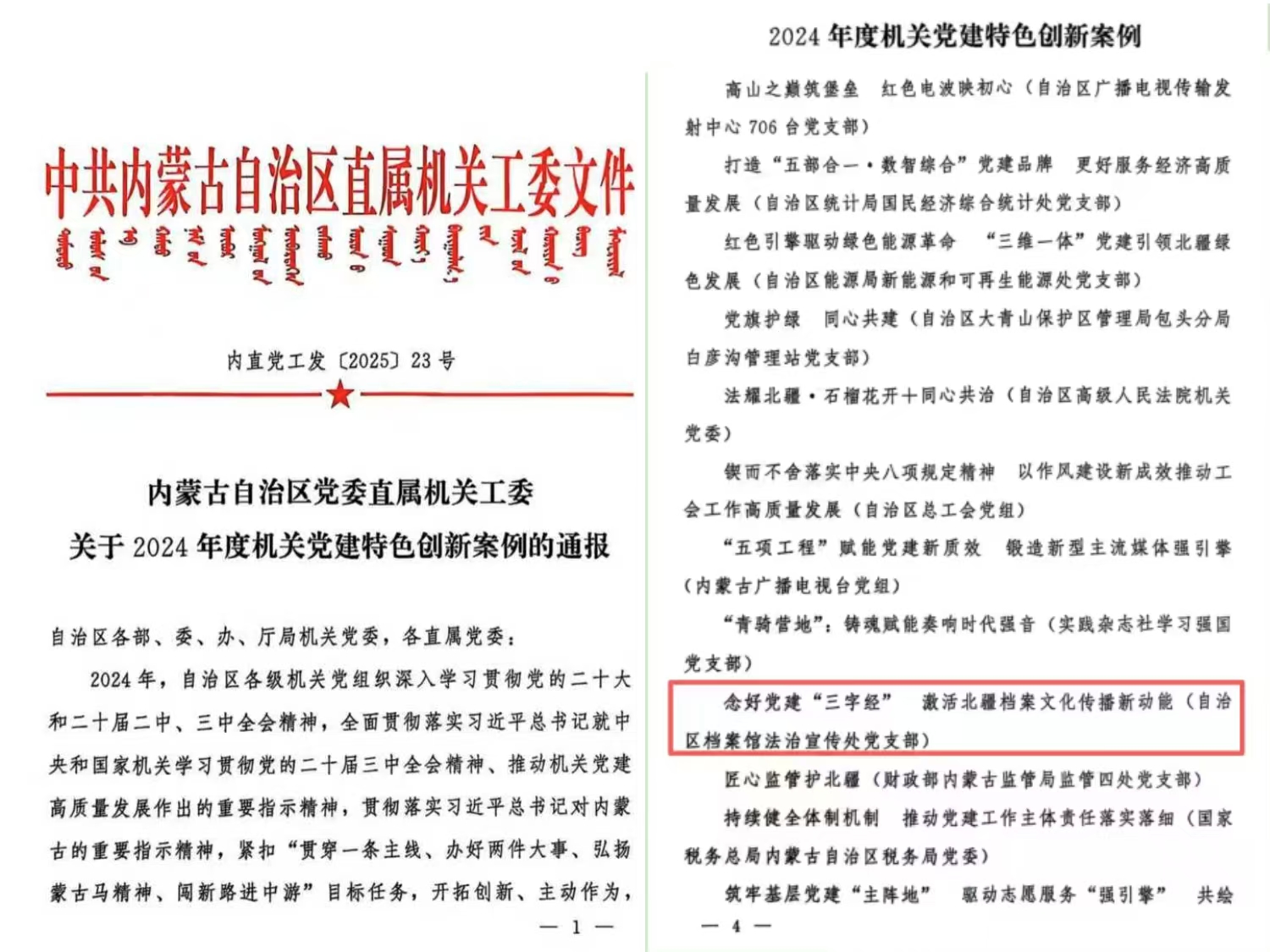 近日,内蒙古自治区党委直属机关工委发布《关于2024年度机关党建特色创新案例的通报》,在自治区范围内评选出36个可复制、可推广的机关党建特色创新案例成果。内蒙古自治区档案馆法治宣传处党支部申报的《念好党建“三字经”,激活北疆档案文化传播新动能》典型经验做法成功入选2024年度机关党建特色创新案例!