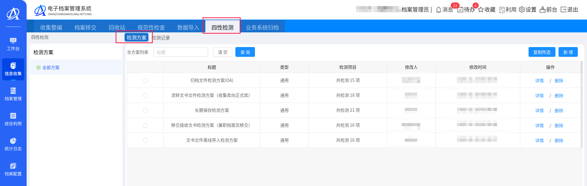 对照国家和自治区有关标准规范,根据水利厅档案管理制度及工作实际,持续优化档案收集、整理、归档、利用、鉴定、保管等业务流程。建设OA系统“预归档”模块,内嵌分类方案、文件材料归档范围和档案保管期限表(水利厅机关“三合一”制度),有效前置收集整理工作,全面加强电子文件管理,保障电子文件收得齐、管得好。建立“制度+技术+人员”三重安全防护机制,对档案管理权限进行精细化分,设立预归档库、移交库、整理库、正式库等“四库”,通过自动和手动两种方式,对形成的电子档案进行全流程监测管控,保障电子档案来源可靠、程序规范、要素合规。