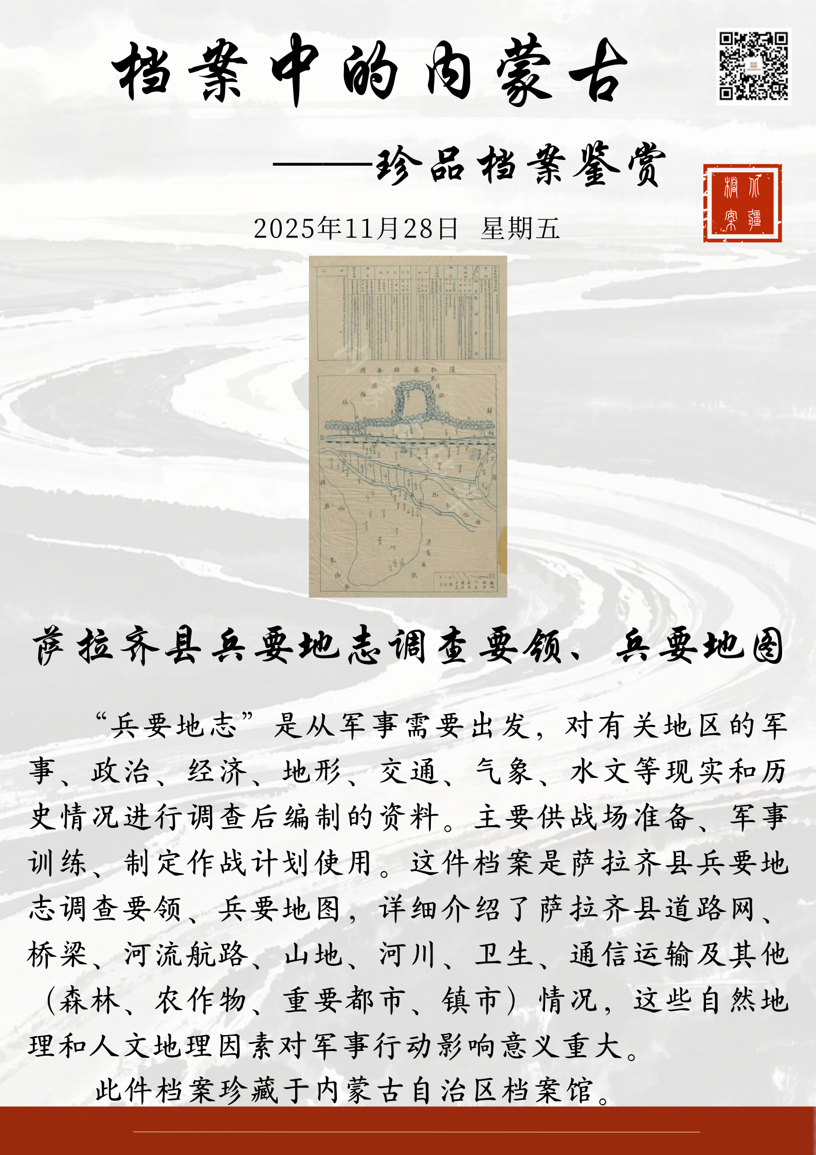 “兵要地志”是从军事需要出发,对有关地区的军事、政治、经济、地形、交通、气象、水文等现实和历史情况进行调查后编制的资料。主要供战场准备、军事训练、制定作战计划使用。这件档案是萨拉齐县兵要地志调查要领、兵要地图,详细介绍了萨拉齐县道路网、桥梁、河流航路、山地、河川、卫生、通信运输及其他(森林、农作物、重要都市、镇市)情况,这些自然地理和人文地理因素对军事行动影响意义重大。