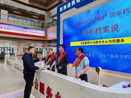 今天是第十八个“6.9”国际档案日,为切实提升档案工作传播力、影响力,营造全社会关心、关注档案工作的浓厚氛围,乌兰察布市档案局、档案馆在市政务服务中心一楼大厅开展以“请听档案说”为主题的国际档案日宣传活动。