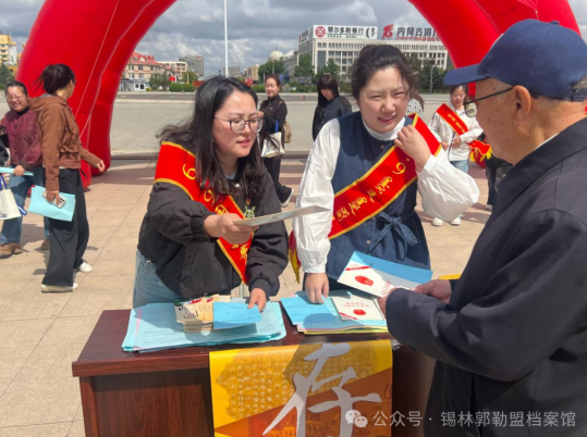 多维联动,深耕档案宣教阵地。锡林郭勒盟档案馆联合锡林浩特市档案史志馆立足国际档案日主题,采用“横幅展示+主题海报+便携折页+宣传袋”等组合宣传模式,深入广场、包联青格勒社区开展“请听档案说”系列宣传活动。活动现场,广场LED大屏滚动播放档案法,工作人员通过宣传档案小常识、解读《中华人民共和国档案法》《中华人民共和国档案法实施条例》等形式,普及了档案有关知识,解答了群众档案疑惑问题,让档案真正“活起来”“动起来”,走出库房、融入群众。锡林郭勒盟公安局留置看护中心、国家能源平能(锡林郭勒)煤炭销售有限责任公司和乌兰图嘎煤炭有限责任公司等单位参加活动。